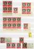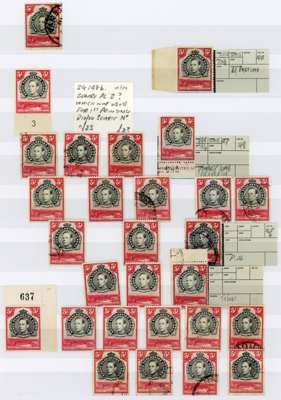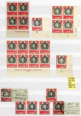 1938-54 5/- collection on two stocksheets. Perf 13¼ four mint, perf 14 six mint one with Plate 3; perf 13¼ x 13¾ mint imprint block of eight (splitting), part imprint block of four, Plate 3 block of four, Plates 2 and 3 singles and an example with initials scratched in margin. Also some used. SG 148, a, b