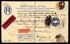 POSTAL HISTORY: 3a registered stationery envelope (size H) to London, uprated on reverse 1a, 2a and 2½a x2, and 8a all tied Aden Camp cds. On front registered label at bottom and insured label at left. Fine and scare.