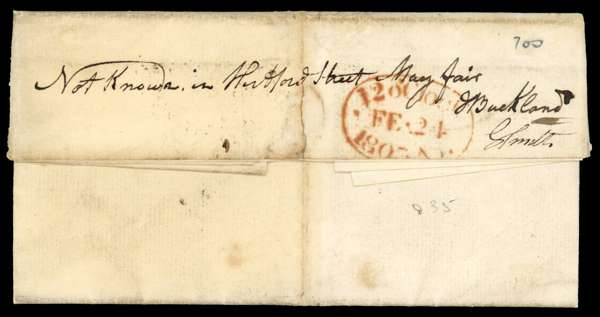 1803 entire letter, to Hartford Street, London, readdressed to Russell Square and then to Harley Street, bearing Two By Post Unpaid, Lombard street oval h/s with ‘2’ numeral h/s crossed out and marked ‘In ALL 4’ handstamp, backstamped by 12 o'clock arrival mark in red for FE 24, usual archival folds, and hinge reinforcement, still a fine example of this rare marking. Willcocks L636