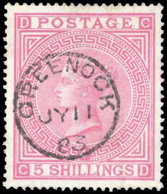 1867-83 Large Anchor, blued paper, 5s rose, plate 4 (CD), neatly cancelled by ‘GREENOCK/JY 11/83’ cds, pressed crease at right nevertheless a most attractive example of this scarce stamp. SG 130