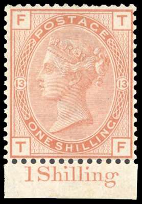 1880 1s orange Plate 13 (TF) lower marginal with part marginal inscription ‘1 Shilling’, large part o.g. some perf separation, otherwise very fine, rare in this from. SG 151