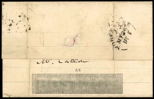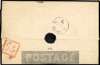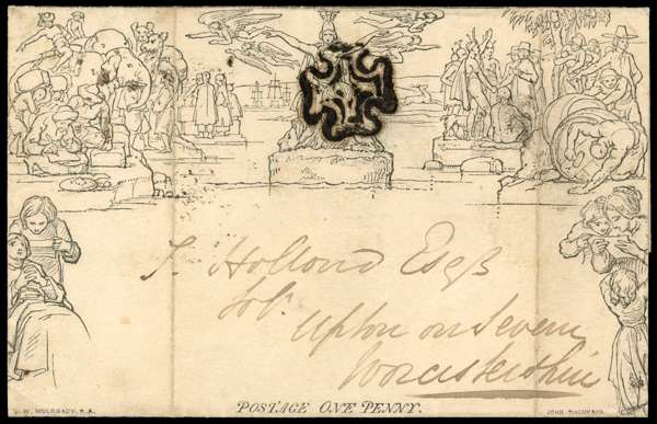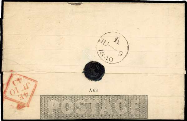 1840 pair of 1d Mulready letter sheets with one from Forme 1, Stereo A6, addressed to Worcestershire and struck with a black MC and backstamped by a Lombard Street branch office mark for 29 MY 1841 and Worcester cds for the following day, the other from Forme 3, Stereo A63, addressed to Loughglynn, Ireland, bearing a red MC and 'Blandford St' mark, backstamped by cds for JU 9 1840 and a red Irish double frame diamond for the following day. Slight peripheral faults and usual filing creases, still an attractive pair. SG ME1