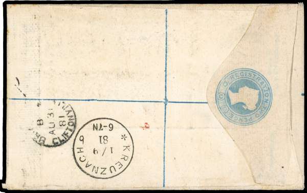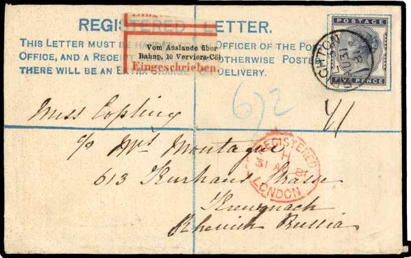 1881 5d indigo on 2d registered stationery envelope (size F) to Germany, tied Brighton cds 'AU 31/81' London registered mark below in red. A most attractive cover. SG 169