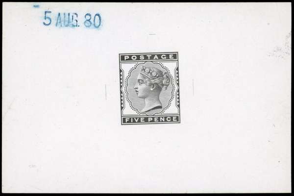1880 5d indigo, die proof printed in black on white glazed card (92 x 160mm), dated ‘5 AUG 80’ in blue. Fine. SG 169var