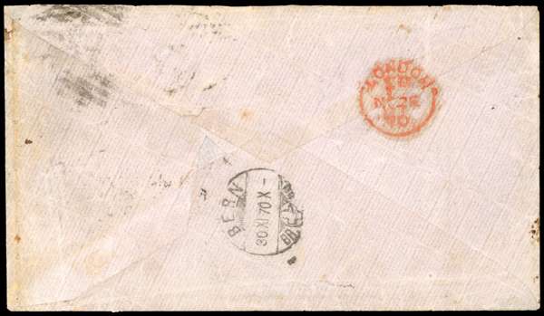 1870 (27 Nov) envelope to Berne, Switzerland bearing 1864-79 1d red, plate 135, cancelled by Bury ‘154’ duplex and Postal Fiscal 1867-81 1d lilac, vertical pair, cancelled by numeral in barred oval, the obverse with ‘INSUFFICIENTLY/STAMPED’ hs, backstamped with London transit and Berne arrival cds. A most unusual franking. SG 43, F19