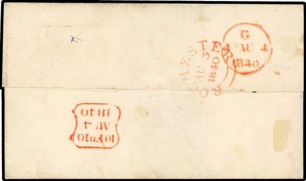 1840 envelope addressed to Islington, franked by 1d black, Plate 6 (SA), four close to good margins and showing SA re-entry and tied by bold red MC and backstamped with Colchester d/s for AU 3 and two datestamps for the following day. SG 2, Spec. AS42a