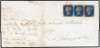 1840 2d blue horizontal strip of 3, plate 1 (JH/JJ), trimmed at foot, on entire to Basingstoke, tied