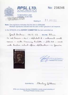 1852-53 ‘Treasury Roulette’ 1d red-brown, plate 149, (AJ), cancelled by numeral in bars oval. A fine example of this scarce perforation trial. RPS Certificate (2024). SG Spec B2aa