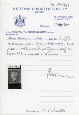 1854 1d orange-red Plate 173 (HC) unmounted o.g., very fine with vibrant colour very rare to find in such pristine condition. RPSL Certificate (2007) SG 17; Spec C1(5) £1600