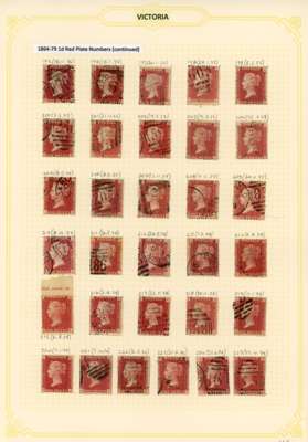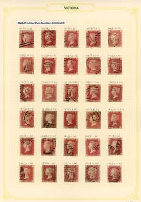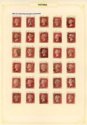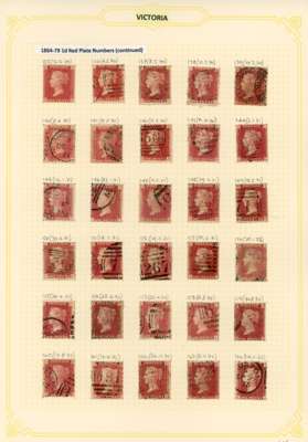 1864-79 1d red, plates 71 to 225, neatly arranged on album leaves
