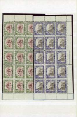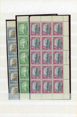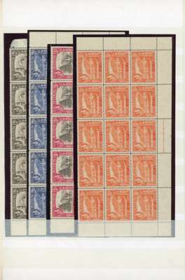 The sheet format precludes fully-matched blocks. The ½a to 2½a plus the 8a were in sheets of 16 rows of five stamps each, the 3a and 14a 8 rows of ten stamps each, and the rupee values in 12 rows of five stamps each