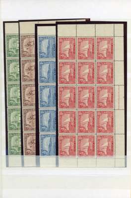 1939-48 set of thirteen in blocks of fifteen, the bottom three rows of the sheet with imprint in each case save the 3a block, which is also a block of fifteen from the lower left corner with imprint, and the 14a which is from the lower right corner with imprint and Plate 1. Unmounted mint with creamy o.g., a couple of low values with damaged right selvedge (and one 2a with associated slight damage). SG 16-27, £1950