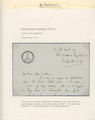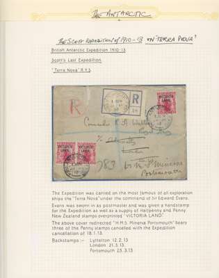 ‘Terra Nova’ Expedition. 1913 (JA 18) registered cover (with contents) from E.G.H.R. Evans to Commander R.H. Walter at the Admiralty, London, subsequently redirected to H.M.S. ‘Minerva’ at Portsmouth, franked by Victoria Land 1911-13 1d carmine (3 - single and horizontal pair), tied by two strikes of ‘BRIT. ANTARCTIC EXPD.’ cds with blue/white registration label alongside, backstamped at Lyttelton and Christchurch (12 FE), London (21 MR) and Portsmouth (MR 25); the letter, written on official Expedition notepaper and headed “In the pack ice, Lat 71° 40's Long 166° 0's, Sunday Jan 5 13”, with details of the journey to New Zealand, the fitting out of the ‘Terra Nova’, the discovery of a stowaway, and their arrival at the edge of the ice; the envelope with a few imperfections, nevertheless a fine letter from the Captain of the ‘Terra Nova’.