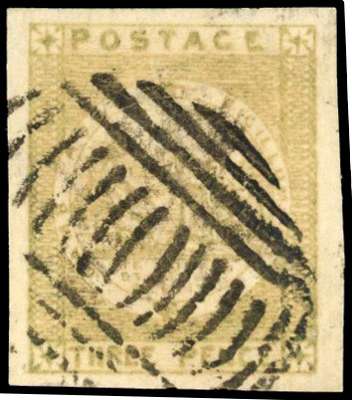 1850 3d yellow-green on soft yellowish wove paper with good to large margins on all sides and neat central obliterator. SG 39 £350