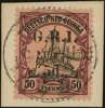 1914-15 5d on 50pf black and purple on buff, 6mm spacing from Setting VI, pos. 3, tied to piece by light RABAUL cds, dated "1 JA 15" (in error for "16"). Very scarce from this setting (rated by Gibbs at 5x normal), especially in used condition. BPA cert (2022), SG 10, £1,100.