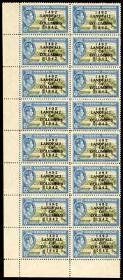 1942 Landfall 6d olive-green and light blue positional block of sixteen, top right stamp with R5/2 COIUMBUS flaw. Unmounted o.g,, rather toned. SG 169a, £1000