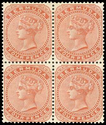 BERMUDA: 1904 4d orange-brown block of 4 with watermark reversed, light crease affecting top pair. A rare multiple as only 3