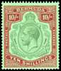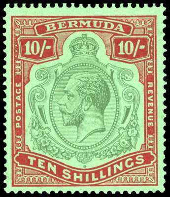 BERMUDA: 1930 10s green and red on deep emerald, showing R1/9 ‘break through scroll’ variety, fine o.g. SG 92gd