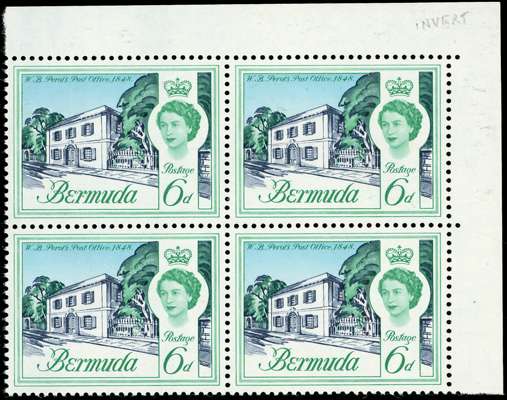 Bermuda 1962 Buildings 6d Perot Post Office variety watermark inverted block of 4, SG 168w Mint