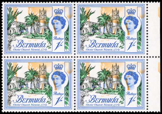 1962 1/- Christ Church, Warwick right marginal block of four, showing substantial (11mm) shift of orange to right. Unmounted o.g. Rare. SG 171 var; the Bermuda Specialised catalogue rates singles at $250 each