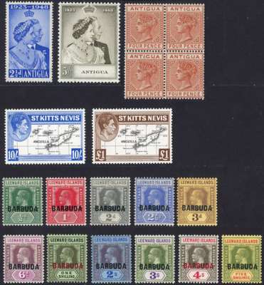 1863-1948 mint selection arranged on stockcards including 1863-7 rough perf 1d dull rose pair, 1884-6 1s mauve, 1908-17 MCA set to 2s, 1921-29 £1 purple and black on red (2), 1932 Tercentenary set to 5s, 1935 Silver Jubilee 2½d ‘Dot to left of chapel', 1s ‘Dot by flagstaff’ (2); Barbuda 1922 set to 5s. Mostly good to fine. (45)