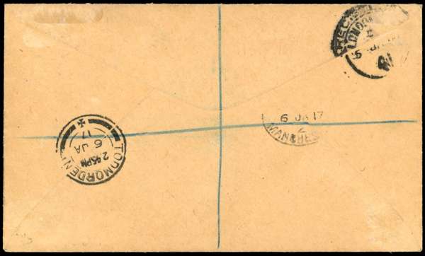 1916 registered envelope to England, bearing KG V 4d and 7d tied by Ascension code B datestamps for 15 DE 16. Registered label at lower left and PASSED CENSOR/ ASCENSION handstamp at upper left. Backstamped London, Manchester and Todmorden. Scarce. SG Z45, 47a