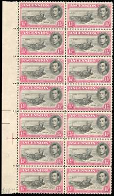 1949 1½d black and carmine, perf 14. Mint positional block of fourteen, unmounted o.g., showing both the R3/1 cut mast and railings and 5/1 davit flaw. A scarce multiple from this printing. SG 40ea, eb, £900