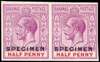 1922 imperforate printer's sample pair in reddish purple and red on unwatermarked paper, each overprinted SPECIMEN Type DS1