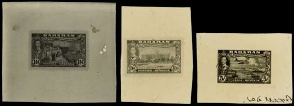 1948 photo engraved acetates for the Eleuthera 1½d, 10d and 5s values, ex the CBNC archives. Unusual. SG 180, 187, 190