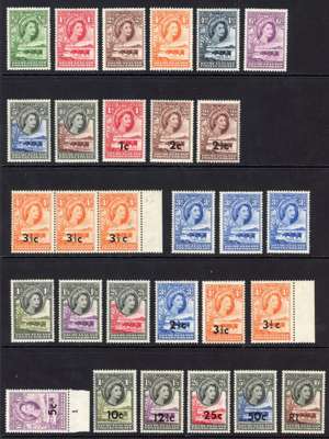 1955-61 mint collection. 1955 set plus 3d bright ultramarine; 1961 surcharge set with extras including 3½c Type I and II wide surcharge, 1r with all three variants, the rare Type I lower marginal with frame plate 1; 1961 new designs definitives. All unmounted o.g. STC £734