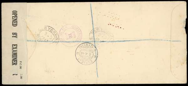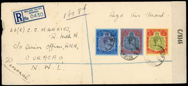 1945 registered censored cover addressed to Curacao franked with 1938-53 perf 14 2s, 2s6d and line perf 14½ 5s, individually cancelled by Ireland Island cds, backstamped New York (31.3) transit and Curacao (3.4) arrival cancels. Fine.