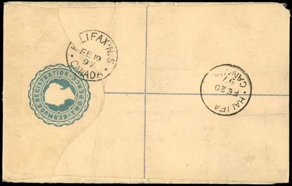 Bermuda SG 11 pair on 1897 registered envelope to Nova Scotia