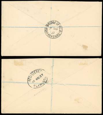 1927 pair of McMichael covers; the first bearing 2s purple and bright blue on pale blue cancelled by Warwick West cds, the second bearing 5s green and carmine-red on pale yellow cancelled by Crawl cds; both envelopes with minor ageing, otherwise an attractive pair. SG 53d, 88