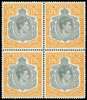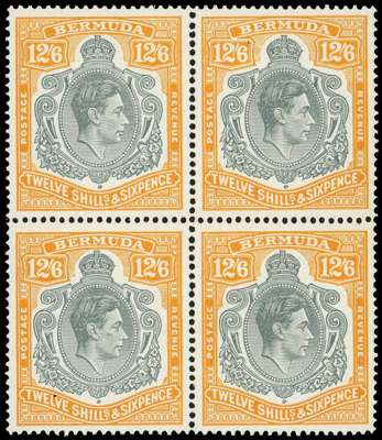 1943 (March) 12/6d pale bluish grey and orange-yellow block of four, #s 11-24 with HPFs #11a, 12a, and c (the latter only found on this printing). Unmounted o.g., the lower left stamp with pencil notes on reverse (ex Ulrich). SG 120c, £520