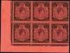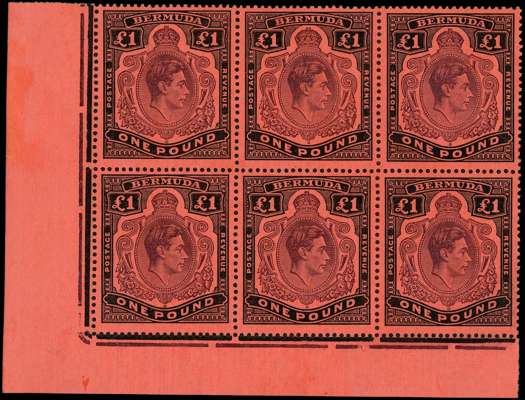 1946 £1 deep reddish purple and black on pale red paper corner block of six with HPFs including #49a cut scroll, c, unmounted o.g. SG 121c, £360
