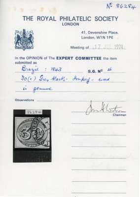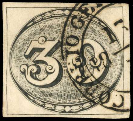 Bull's Eye: 1843 Worn Impression 30r good to close margins, fresh used with part datestamp, RPSL Certificate (1974)