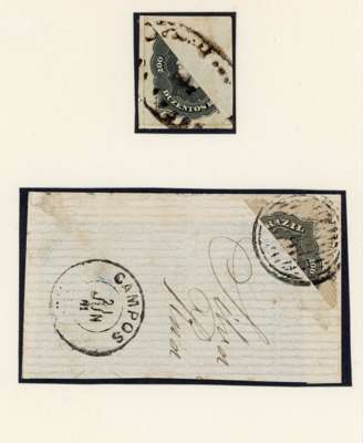 Dom Pedro: Collection on pages with 1866-68 perforated values including 80r large part o.g. horizontal pair (one with perf fault at top) unused (2), two 200r bisect on pieces, 1876-77 rouletted issues with some cancellation interest, 1878-79 White Beard duplicated used with four of each, fair to fine condition (170+)