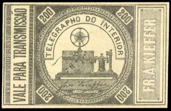 Telegraph Stamp: 1873 200r on thick paper showing the machine used by Fr A Kieffer, fine unused