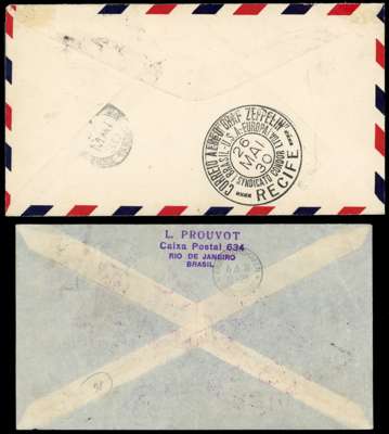 Airmails - Postal History: 1930 (22 Mai) cover to New York franked ‘Graf Zeppelin/ U.S.A.’ overprint set of three plus 300r definitive carried on Recife - Lakehurst second stage of flight from Rio de Janeiro; some slight ageing around perfs.