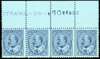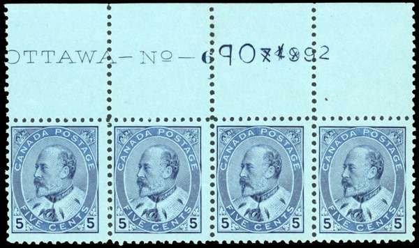 1903-12 5c blue on bluish paper upper marginal strip of four with OTTAWA - NO - 6 imprint, showing adjacent Order Numbers partially deleted. The stamps unmounted o.g., the right stamp with a tiny adhesion. A scarce piece. SG 178