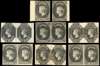 1857-59 group of imperforate plate proofs in black on unwatermarked paper, comprising 1d and 2d singles (both marginal), 4d, 6d, 10d, 1s, 1s9d and 2s horizontal pairs, variable margins and a couple of trivial blemishes otherwise fine. SG 1, 2/4, 9/12 (8 proofs)