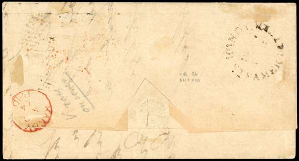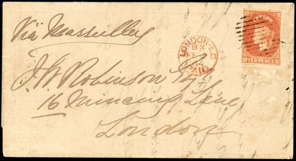 1864 (JA 7) lettersheet from Kandy to London, endorsed ‘Via Marseilles’ and bearing 1857-59 10d vermilion with three margins, tied by light grid with London arrival cds (FE 2) alongside, Kandy despatch cds on reverse, central filing fold otherwise neat and attractive, a scarce franking. SG 9.