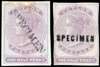 1857-64 ½d reddish lilac on blued paper, imperforate, two examples handstamped SPECIMEN, respectively Samuel types D1 (diagonal) and D2, large part o.g., the former repaired at top and the latter cut close, but a very rare pair with just a handful of each recorded. SG 16