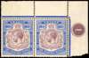 1921-32 100r dull purple and blue, wmk Script upper right corner pair showing plate number 1 in margin, unmounted (yellowed) o.g. although both bearing a few black paper fibres on reverse from previous backing adhesion. All vertical perfs separated although the pair (and margin) would be simple to reunite with a hinge. Very rare positional examples of these handsome high values. SG 360 cat £5,500