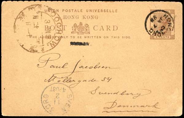 China Hong Kong 1898 combination card to Denmark with local postage paid in cash with Foochow Dollar Chop (3 Jan) red surcharge 4c on 3c Hong Kong stationery card with index c date stamp, Svendborg arrival cds at base, top right and bottom right strengthened, corner creases and still a good example of this unusual ‘cash paid’ combination.