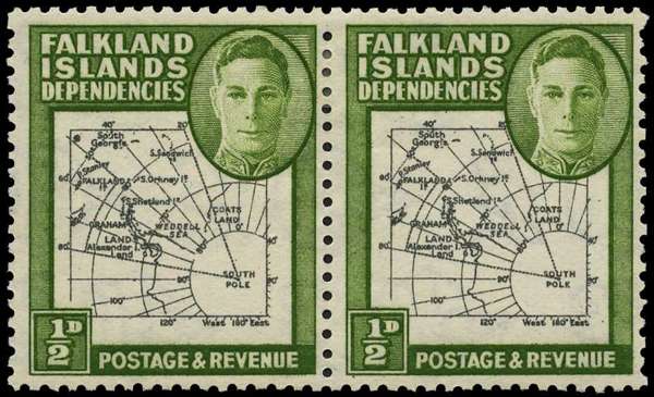 1946 Thick Map ½d pair, large part o.g., left stamp with Plate 1 R3/9 extra island. SG G1aa, £325