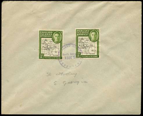 1946 Thick Map ½d, two examples on local cover tied by neat violet South Georgia CDS of 1 DEC 46, the right-hand stamp with Pl. 1 R4/6 extra dot by oval. SG G1d