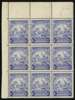 1938 2½d ultramarine u/m corner block of nine with R1-3/3 mark on central ornament. Selvedge with a minor crease, and a tear by R1/1, still fine and with striking colour. SG 251a, cat £165