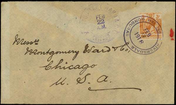 POSTAL HISTORY: 1918 very fine full Riversdale cds (13 FE 1918) tying a 3c KGV issue to a Montgomery Ward cover, addressed excised from reverse, fine example of this scarce cancel