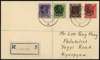 POSTAL HISTORY: 1942 (25 AUG) local registered "Lim Peng Hong" cover franked with 1942 (May) KGVI 3p bright violet, 9p yellow-green, 1a purple-brown and 2a carmine, optd. with type 2 peacock of Myaungmya, tied by fine strikes of Kyonpyaw cds, with registration label at lower left, attractive and rare, SGJ12,14/6